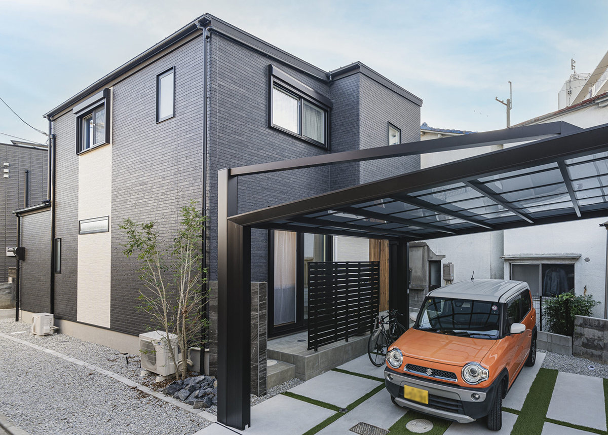 ブラックと木目のアクセントがお洒落なお家。内装はシックで大人かっこいい雰囲気と木目のナチュラルな雰囲気が融合した空間に仕上がっています。
