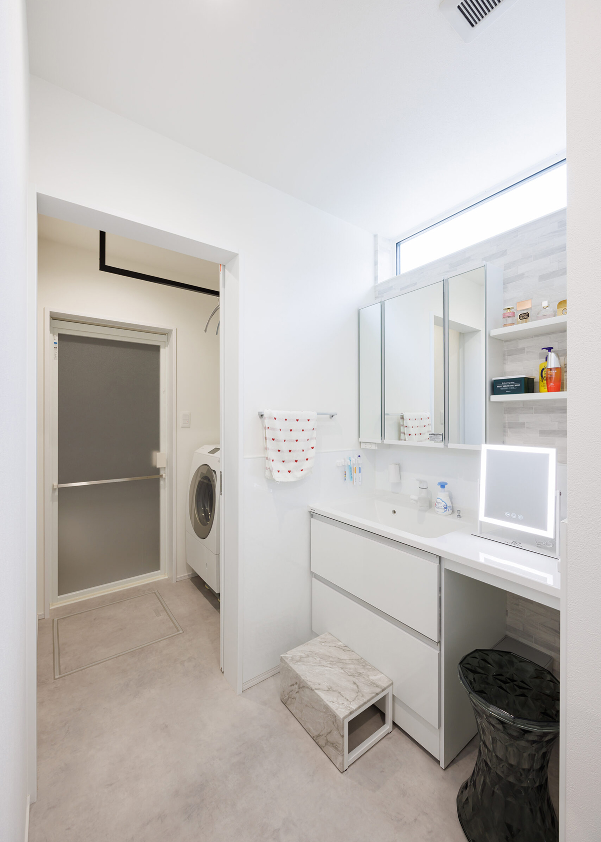 ハイサイドライト(高窓)を付けることで明るい空間です。脱衣室は1.25帖の広さを設けてランドリールームとしても活用ができます。