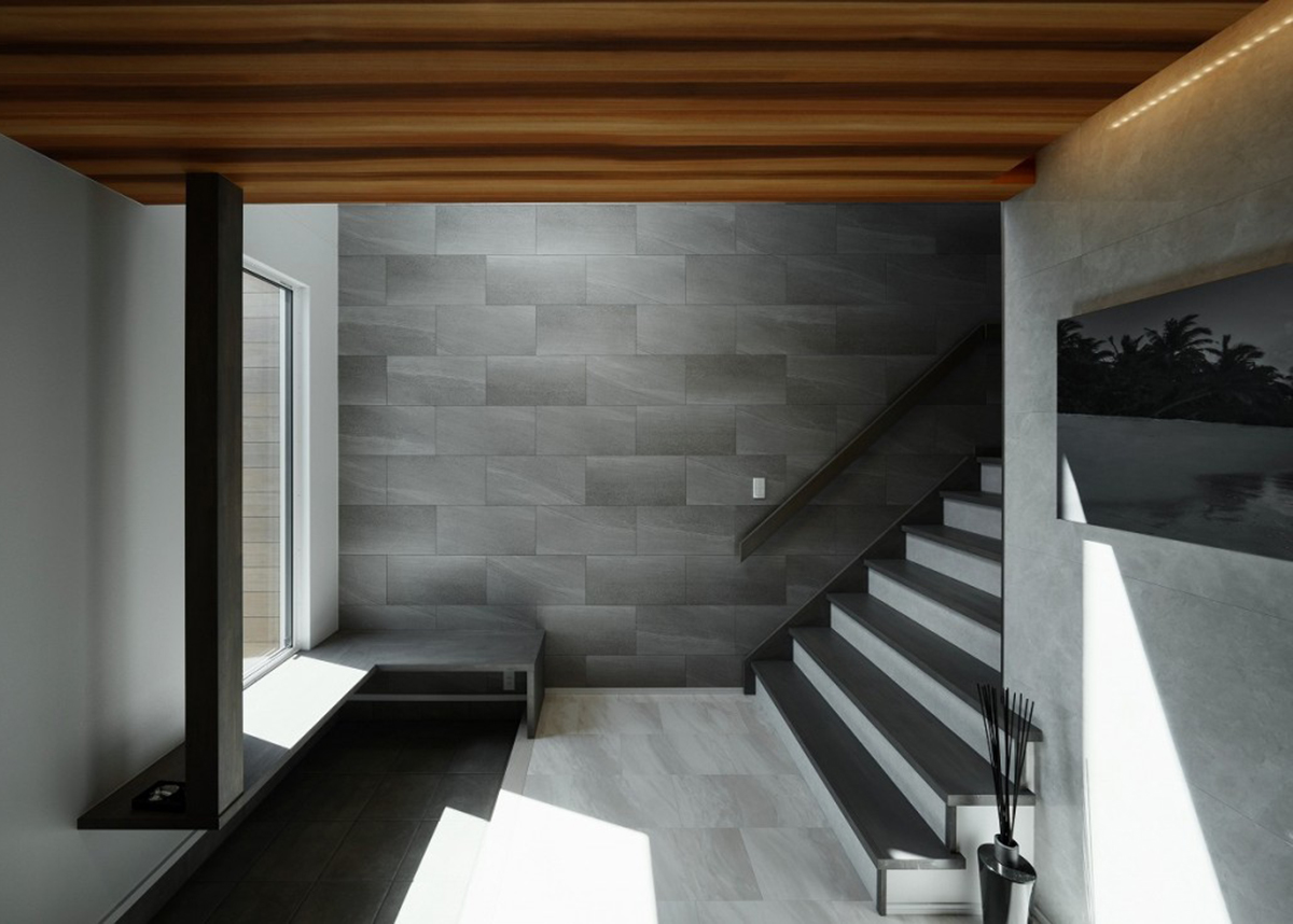 アクセントでベンチを兼ね備えた、少し広めで生活感の出ない美術館のようなおしゃれな玄関ホールです。