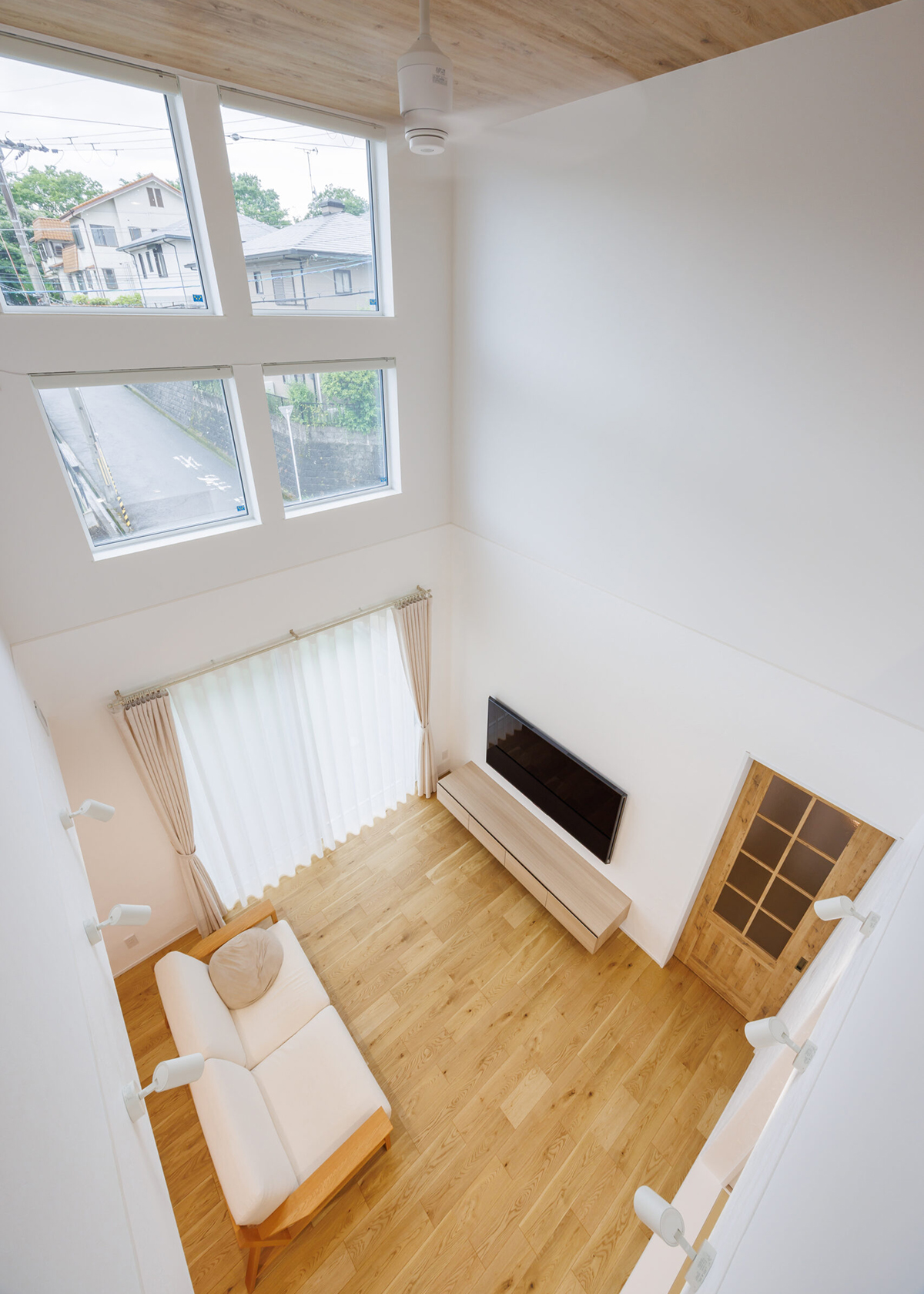 吹き抜け部分の天井には木目のクロスを採用し真っ白な空間のアクセントに!吹抜けの高い位置に四つのかわいいFIX窓もありプライバシー気にせず採光できます!